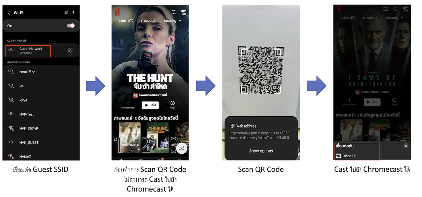 เทคนิคการทำงานของ EnGenius Smartcasting คือการสร้าง SSID สำหรับ Smart TV ให้มาเกาะบน SSID นี้ จากนั้น ทาง admin ก็กำหนดเอา TV เหล่านั้นเข้ามาใน List ที่จะให้สามารถ Cast ได้ และแต่ละ TV ก็จะมี QR Code ของตัวเอง จากนั้นเมื่อเครื่อง Client เกาะ Guest SSID ก็จะยัง Cast ขึ้น TV ไม่ได้ (แต่ TV ออกเน็ตได้ปกติ) จนกระทั่งแขกมา Scan QR Code ที่เราเตรียมไว้ให้ แขกก็สามารถ Cast ขึ้น TV ได้ทันที...