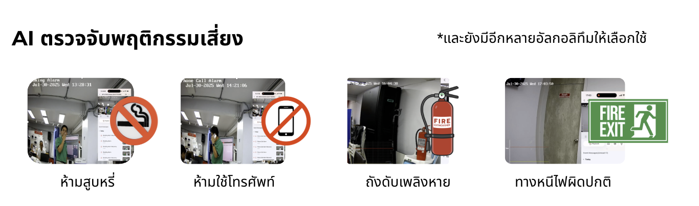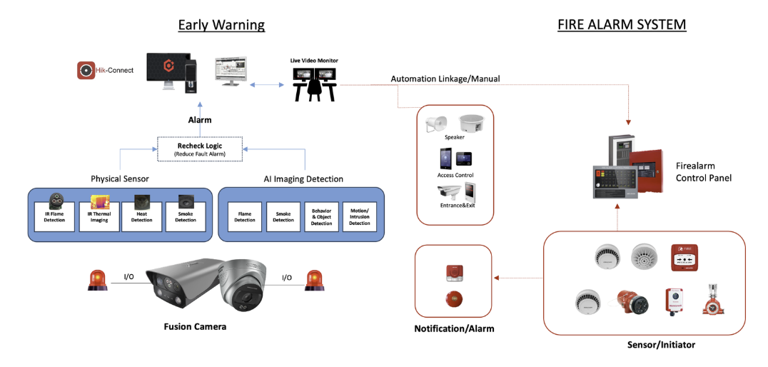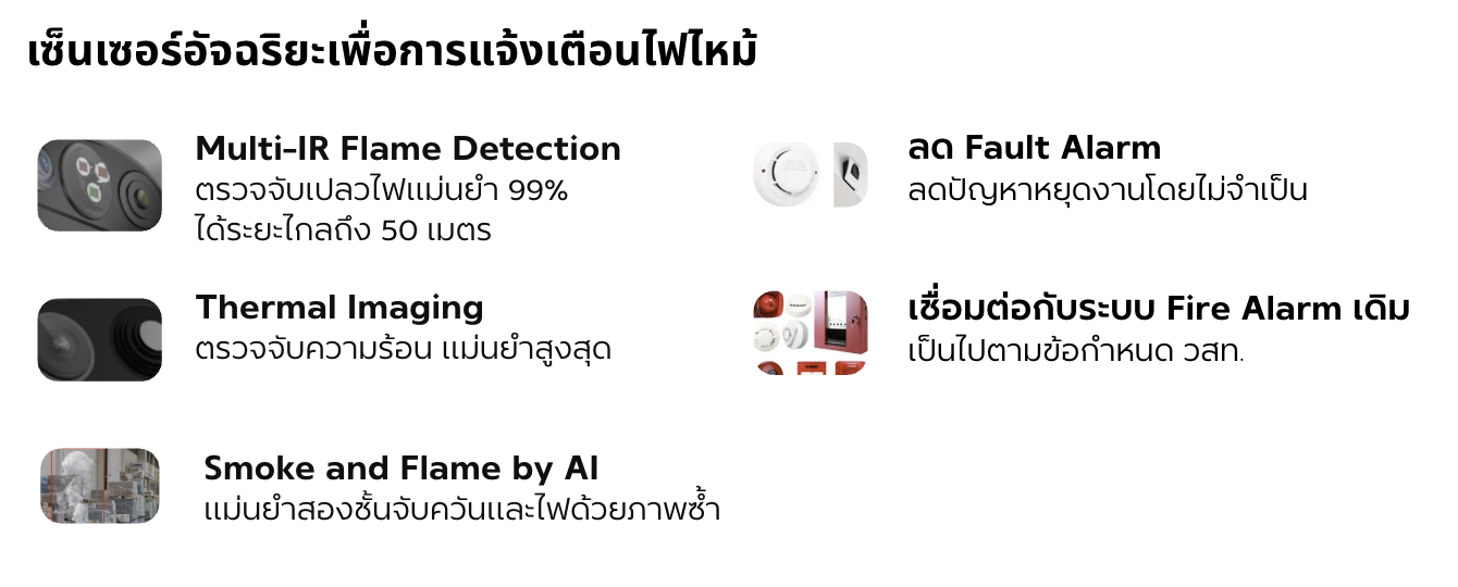ระบบกล้องวงจรปิดอัจฉริยะ ด้วย Sensor 4 ชนิดได้แก่ Heat Detection, Smoke Detection, IR Flame Detection และ Thermal Imaging ที่ออกแบบมาเพื่อตรวจจับไฟไหม้ และแจ้งเตือนล่วงหน้า หรือ Early Warning ได้อย่างแม่นยำ และผสานเกับ AI Video Analytics ที่สามารถวิเคราะห์ ควันไฟ และเปลวไฟ ได้ด้วยภาพและวิเคราะห์พฤติกรรมเสี่ยงต่อการเกิดไฟไหม้และมาตรฐานความปลอดภัยอื่นๆ