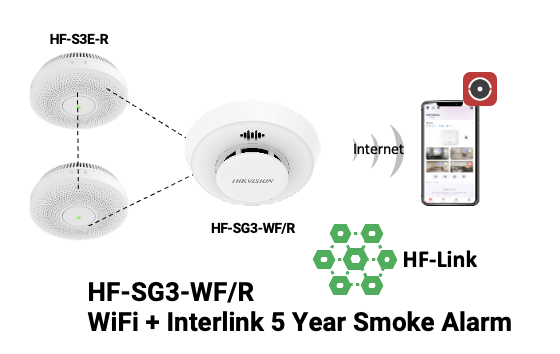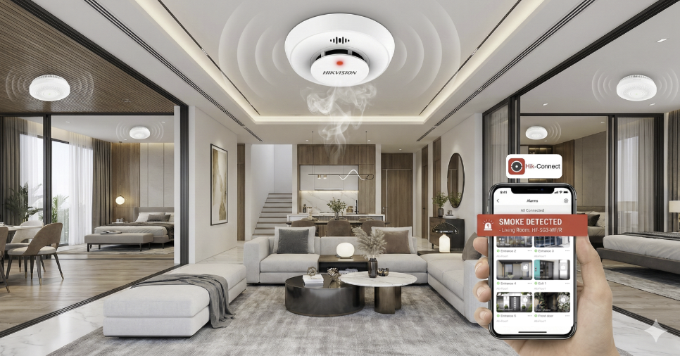 อุปกรณ์แจ้งเตือนไฟไหม้ ที่จะส่งสัญญาณแจ้งเตือนทันทีเมื่อตรวจพบควันไปยังทุกๆห้องในบ้าน และแจ้งเตือนไปยังโทรศัพท์มือถือผ่าน Applicaiton Hikconnect